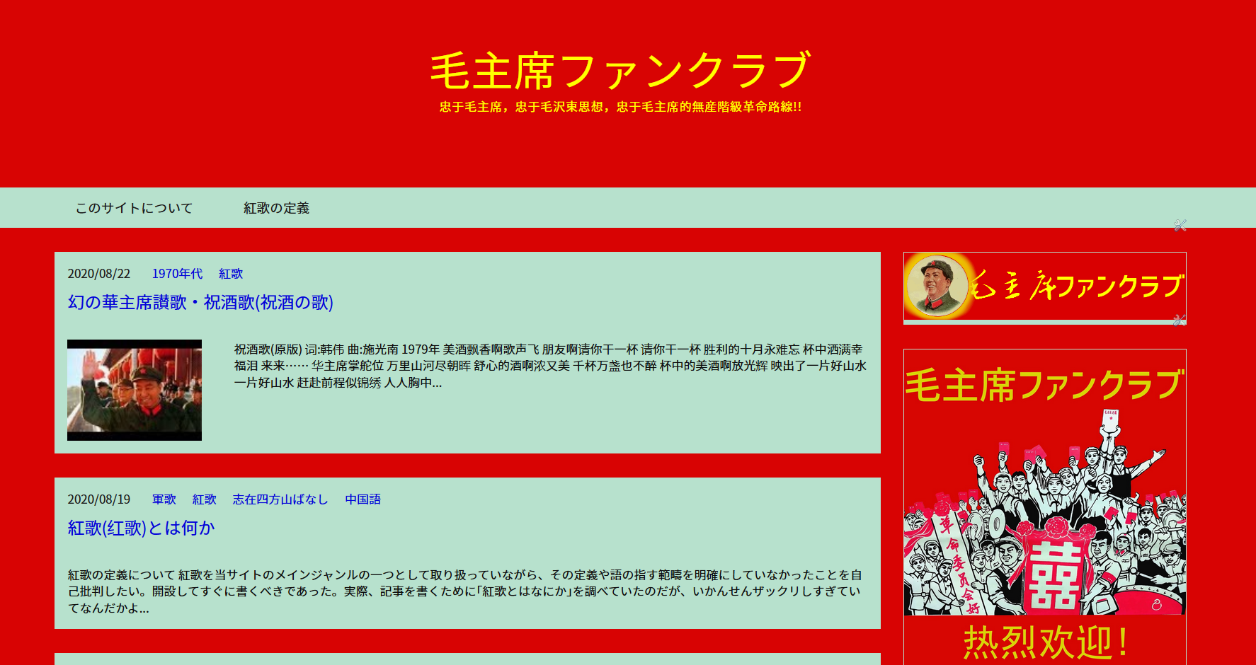 ちなみに、ヘッダーの発光毛主席はサイドに移動しました。ヘッダーにするとGIFが伸びて見栄えが悪いんですよね。でもこのGIFの制作に3時間位かけており、ボツにするのも惜しいので、今は右側で照らしてもらっています。